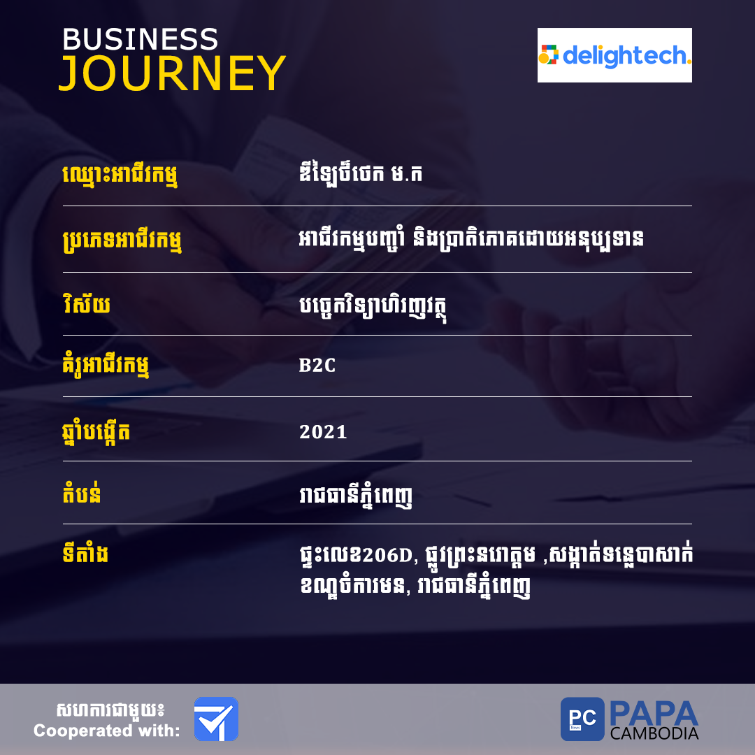 ប្រព័ន្ធបច្ចេកវិទ្យាបានរីកចម្រើនគួរអោយកត់សម្គាល់នាសតវត្សន៍ទី២១នេះក្នុងនោះអាជីវកម្មបែបឌីជីថលក៏មានវត្តមានជាមួយនឹងភាពរីកចម្រើននេះដែរ។ PAPA Cambodia News នឹងធ្វើការណែនាំអំពីអាជីវកម្មមួយមានឈ្មោះថា DELIGHTECH Plc.