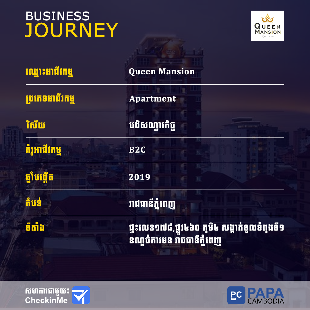 Queen Mansion ជាអាជីវកម្មស្ថិតក្នុងវិស័យបដិសណ្ឋាកិច្ចទេសចរណ៍និងជាអាជីវកម្មអចលទ្រព្យបែប Apartment ហើយត្រូវបានបង្កើតនិងដំណើរការចាប់តាំងពីឆ្នាំ ២០១៨ មកគិតមកទល់ពេលនេះគឺមានរយៈពេល៥ឆ្នាំហើយ។ Queen Mansion មានទីតាំងនៅផ្ទះលេខ១៧៨ ផ្លូវ៤៦០ ភូមិ៤ សង្កាត់ទួលទំពូងទី១ ខណ្ឌចំការមន រាជធានីភ្នំពេញដែលជាទីប្រជុំជនគួរជាទីចាប់អារម្មណ៍របស់មនុស្សគ្រប់គ្នា។ Queen Mansion ផ្តោតសំខាន់ទៅលើការផ្តល់ភាពងាយស្រួលក្នុងការស្នាក់នៅ សេវាកម្ម ការរៀបចំទីកន្លែងស្នាក់នៅ និងធានានូវសុវត្ថិភាព សេរីភាពផ្លូវចិត្តក្នុងការសម្រាកអោយបានល្អបំផុតដល់ភ្ញៀវដែលទៅស្នាក់នៅទីនោះ។ បន្ថែមពីនេះទៀត ក្រៅពីកន្លែងស្នាក់នៅប្រកបដោយផាសុកភាព Queen Mansion ក៏មាននូវអាងហែលទឹក និងកន្លែងហាត់ប្រាណទៀតផង។