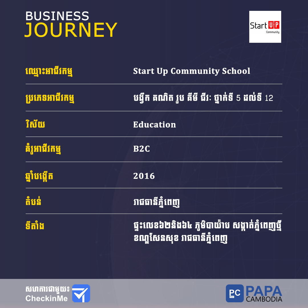 Start Up Community គឺជាសាលាបង្វឹកបំប៉នបន្ថែមមុខវិជ្ជា គណិត រូប គីមី ជីវៈ ចាប់ពីថ្នាក់ទី ៥ ដល់ទី ១២ដល់សិស្សានុសិស្សពីថ្នាក់បឋមសិក្សារហូតដល់ថ្នាក់វិទ្យាល័យ។ Start Up Community បានបង្កើតនៅឆ្នាំ ២០១៦ និងមានទីតាំងនៅ ផ្ទះលេខ៦២និង៦៤ ភូមិបាយ៉ាប សង្កាត់ភ្នំពេញថ្មី ខណ្ឌសែនសុខ រាជធានីភ្នំពេញ។ សិស្សានុសិស្សដែលបានសិក្សានៅសាលា Start Up Community តែងតែទទួលបានលទ្ធផលល្អៗតាមរយៈការប្រលងនានា ជារៀងរាល់ឆ្នាំ។