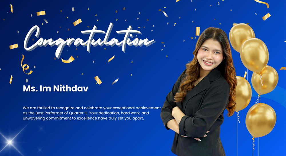 កញ្ញា អ៊ីម នីតដាវ មានតួនាទីជាអ្នកគ្រប់គ្រងអតិថិជន បានបង្ហាញភាពលេចធ្លោតាមរយៈការគោរពវិន័យយ៉ាងខ្ជាប់ខ្ជួន ភាពមានទំនួលខុសត្រូវលើកិច្ចការងារប្រចាំថ្ងៃ និងភាពសាមគ្គីជាមួយក្រុមការងារសម្រេចបាននូវលទ្ធផលវិជ្ជមានជាច្រើនជូនដល់ស្ថាប័នដែលជាកត្តាជំរុញឲ្យកញ្ញាទទួលបានជ័យលាភីបុគ្គលិកឆ្នើមប្រចាំការិយាល័យផ្នែកគ្រប់គ្រងអតិថិជន នៅក្នុងត្រីមាសទី៣នេះ។