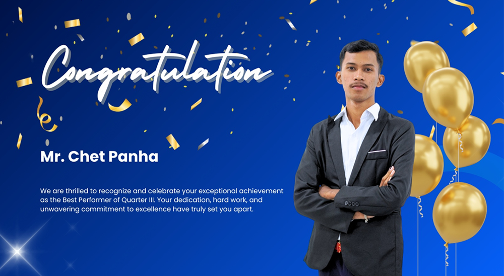 លោក ចេត បញ្ញា មានតួនាទីជាអ្នកជំនាញបង្កើនការលក់ បានបង្ហាញភាពលេចធ្លោតាមរយៈការគោរពវិន័យយ៉ាងខ្ជាប់ខ្ជួន ភាពមានទំនួលខុសត្រូវលើកិច្ចការងារប្រចាំ និងភាពសាមគ្គីជាមួយក្រុមការងារសម្រេចបាននូវលទ្ធផលវិជ្ជមានជាច្រើនជូនដល់ស្ថាប័នដែលជាកត្តាជំរុញឲ្យលោកទទួលបានជ័យលាភីបុគ្គលិកឆ្នើមប្រចាំការិយាល័យផ្នែកបច្ចេកទេសបង្កើនការលក់ នៅក្នុងត្រីមាសទី៣នេះ។